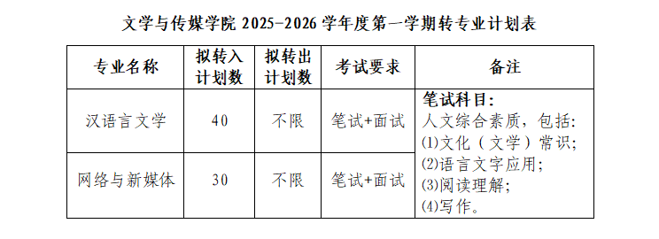 威廉希尔官网今年有汉语言文学、网络与新媒体本科专业接受我校学生转专业申请。基本条件按照《威廉希尔官网学生转专业实施细则》(荆理工教〔2024〕22号)规定执行。专业转入条件如下: