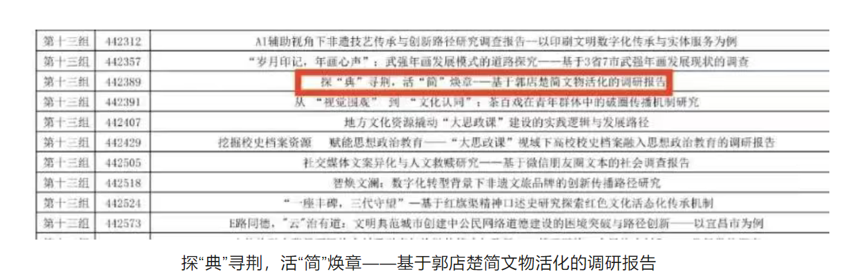 脚踏实地做调研,实事求是解难题。为进一步了解郭店楚简保护与发展现状,四名参赛学生深入实地调研,同沙洋县社科联相关领导、郭店楚简研究总会成员进行座谈,前往纪山镇实地参观走访。调研过程突破传统路径,形成“文献分析——田野调查——数字传播”的创新模式。通过实地调研,报告的思路更加明确,观点更切实际,措施更接地气,为研究提供了更扎实可靠的实际支撑,提升了调研报告的可行性与可信度。