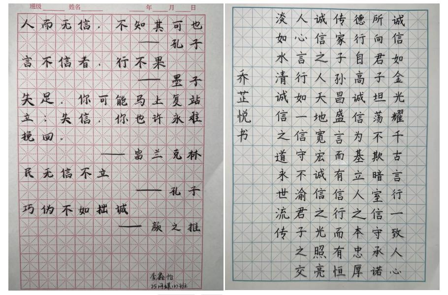 书写是向内的仪式,诚信是向外的承诺。二者结合,让教育有了温度与质感。笔墨虽轻,承载的却是人格的重量;作品虽静,传递的却是鲜活的价值观。通过这一活动,诚信教育从理念转化为实践,潜移默化地影响着学生的价值判断与行为选择。