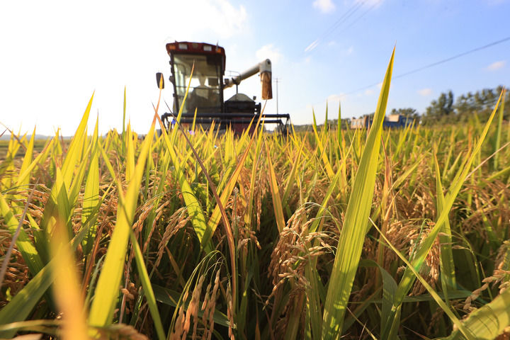 2025年10月16日,在江苏省连云港市赣榆区城头镇中青墩村,种植户驾驶收割机抢收水稻。